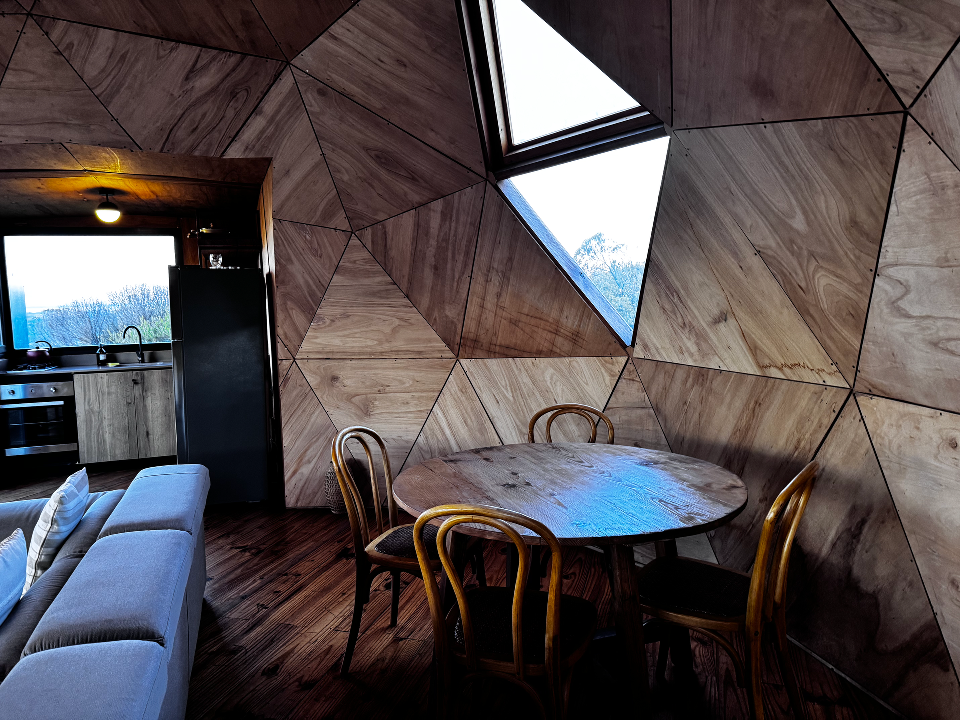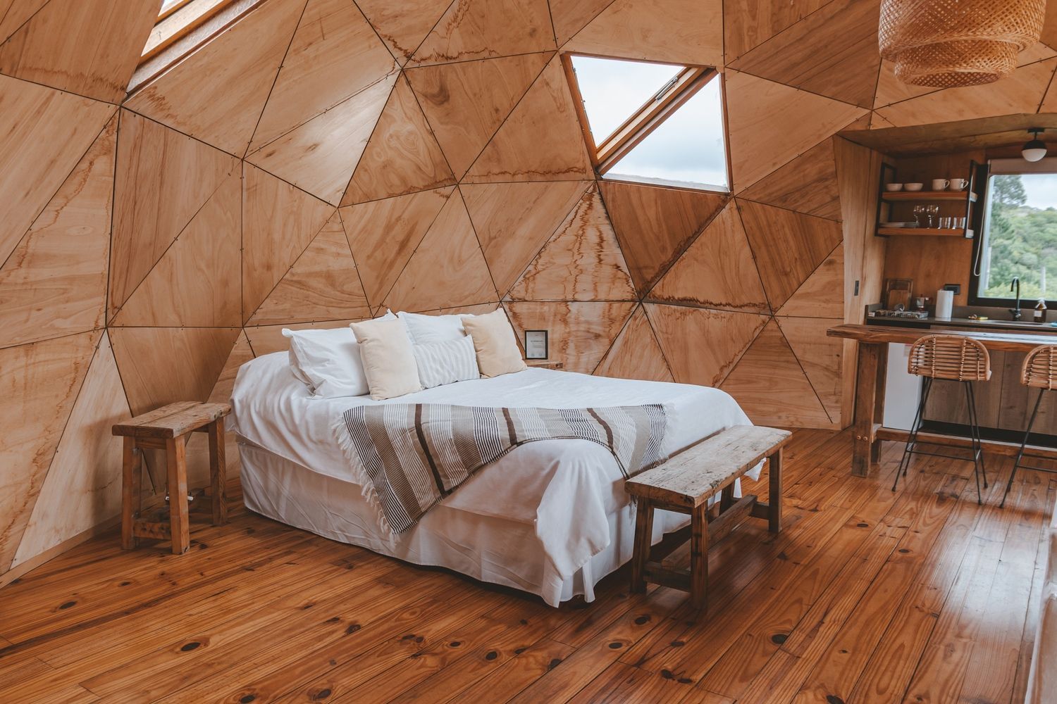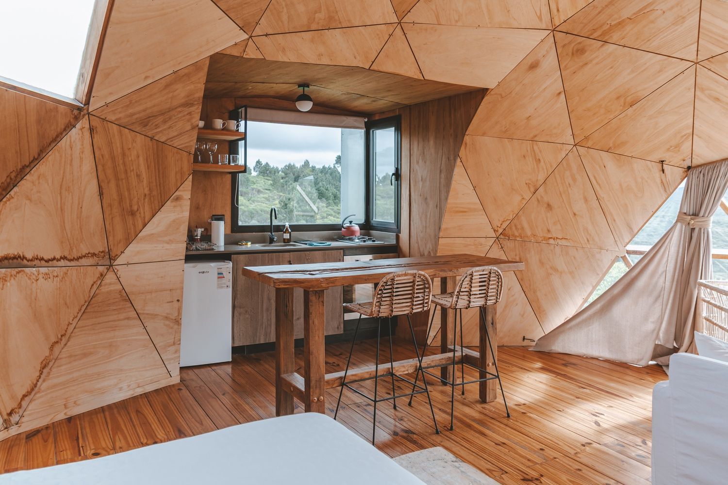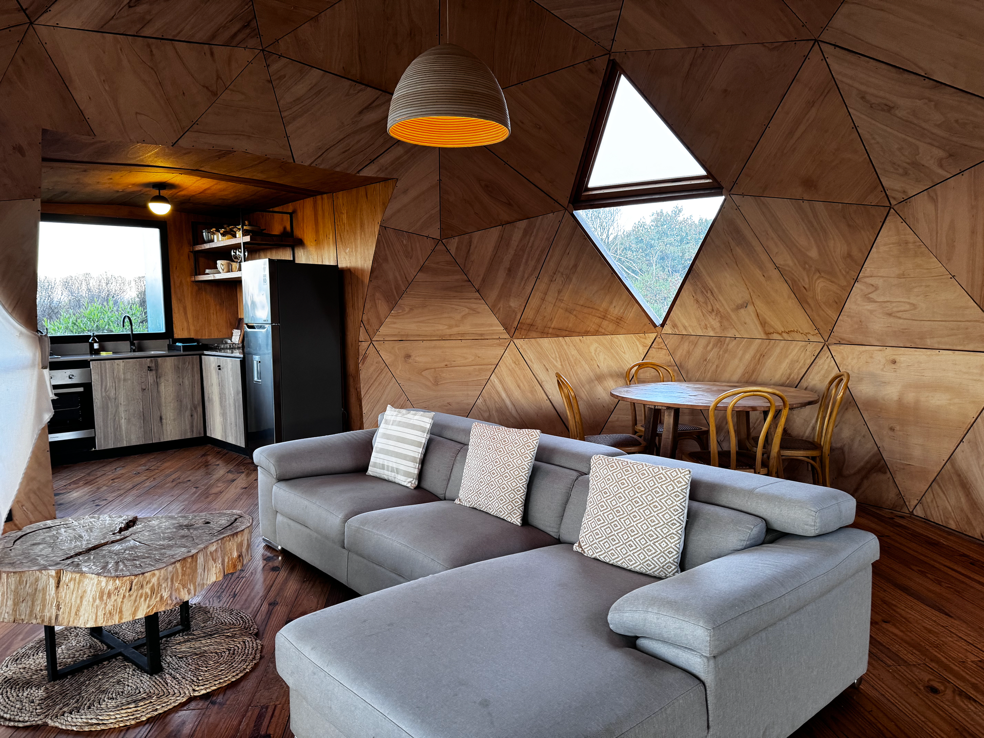 Domo con dos ambientes, dormitorio con cama king y diván, living comedor con sofá cama, cocina integrada. Los ambientes son amplios con ventanales con vista a la sierra.