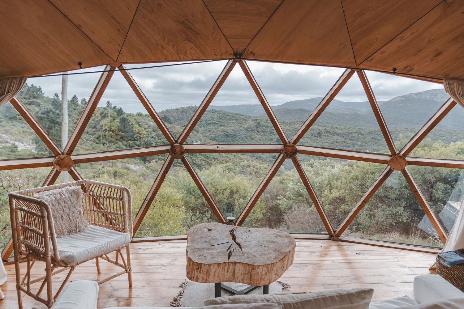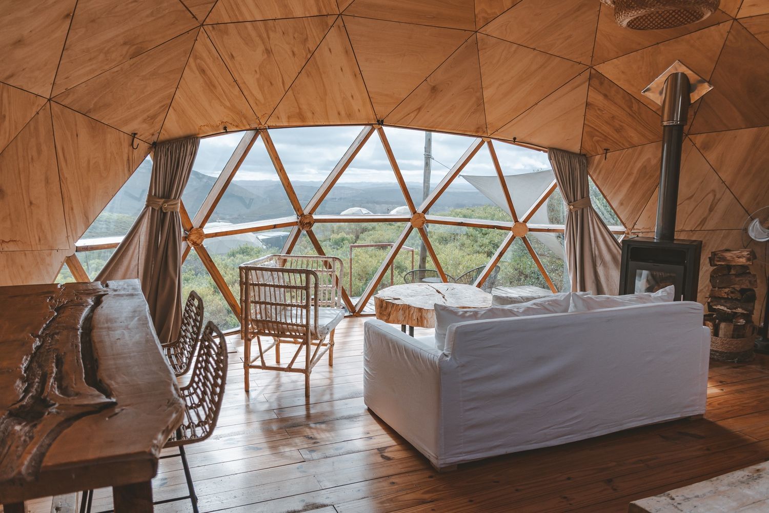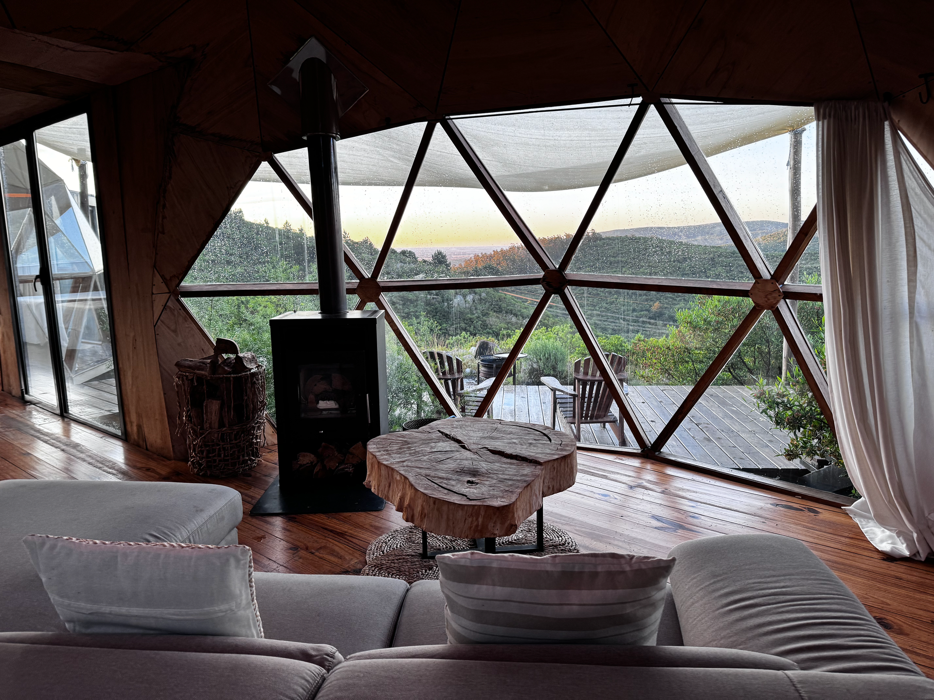 Domo con dos ambientes, dormitorio con cama king y diván, living comedor con sofá cama, cocina integrada. Los ambientes son amplios con ventanales con vista a la sierra.