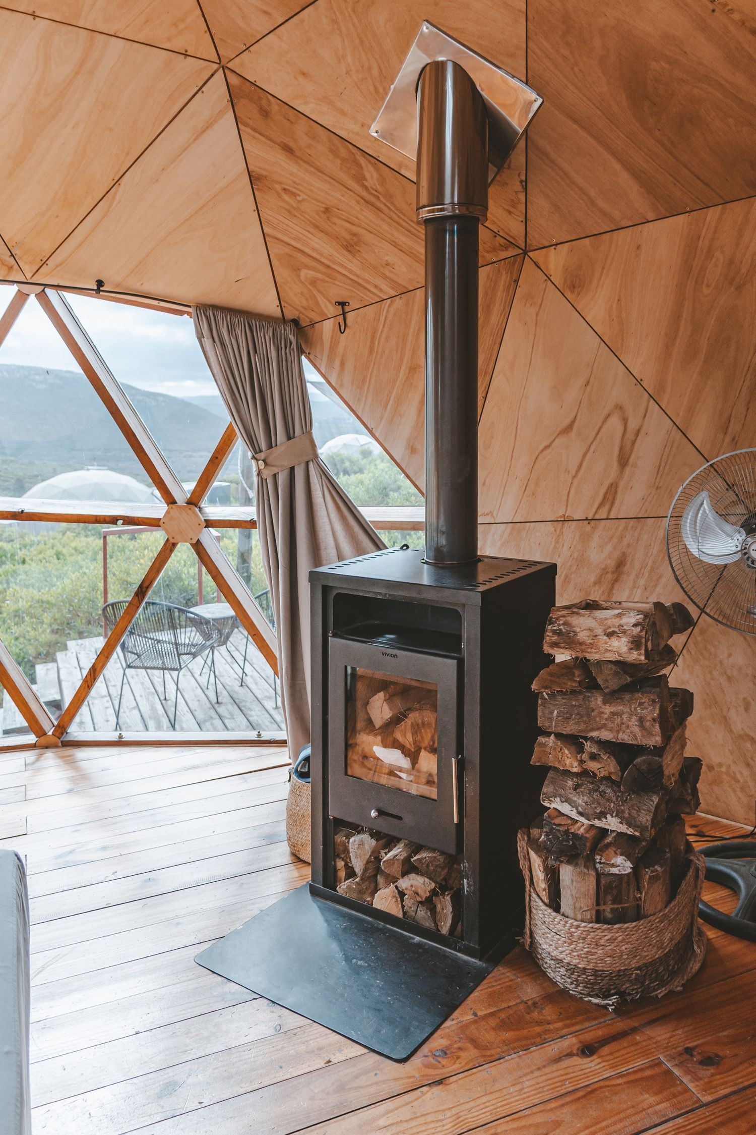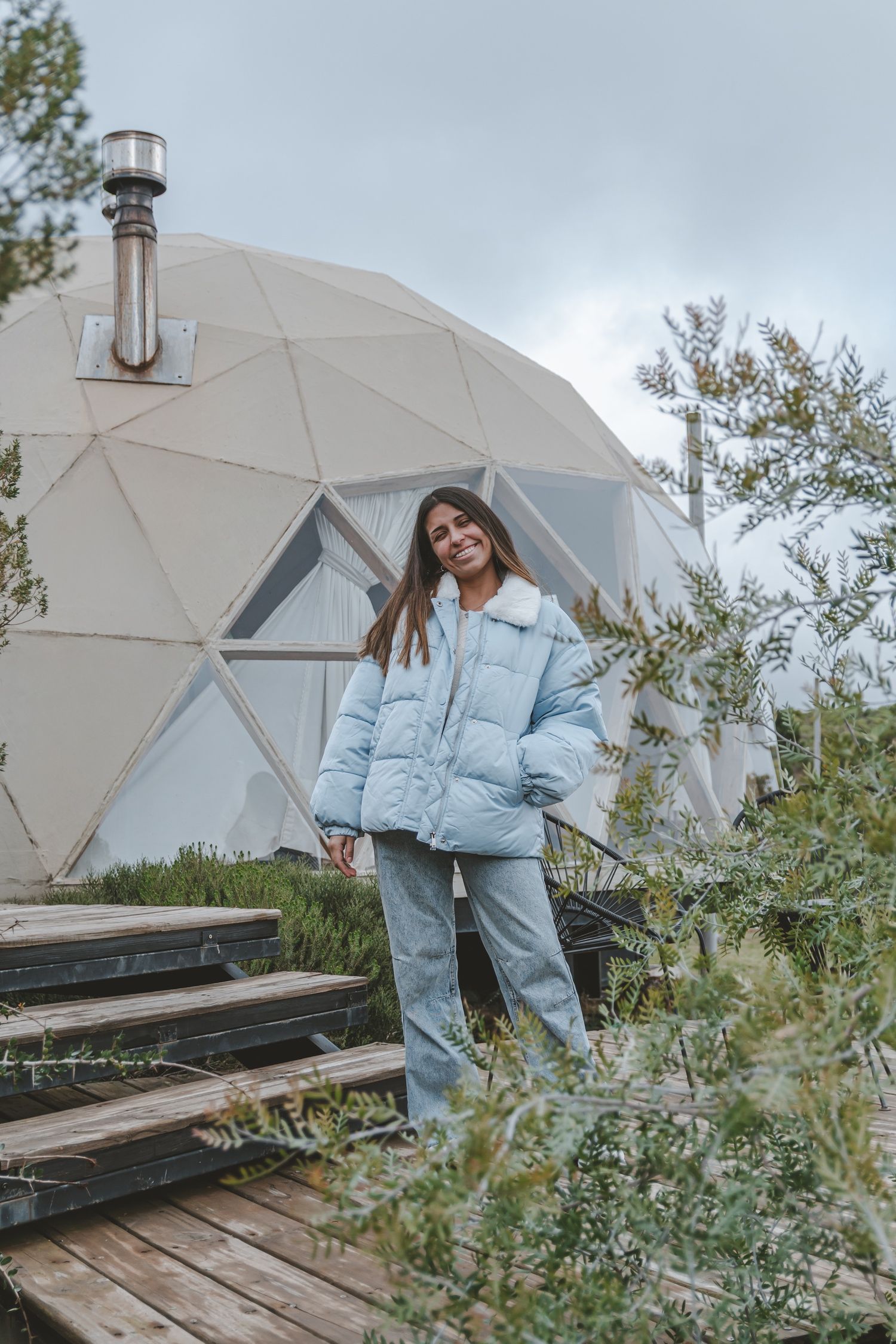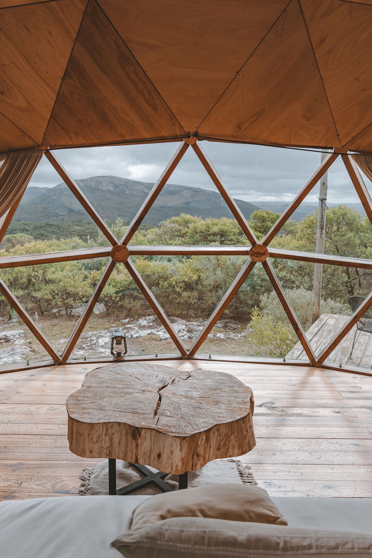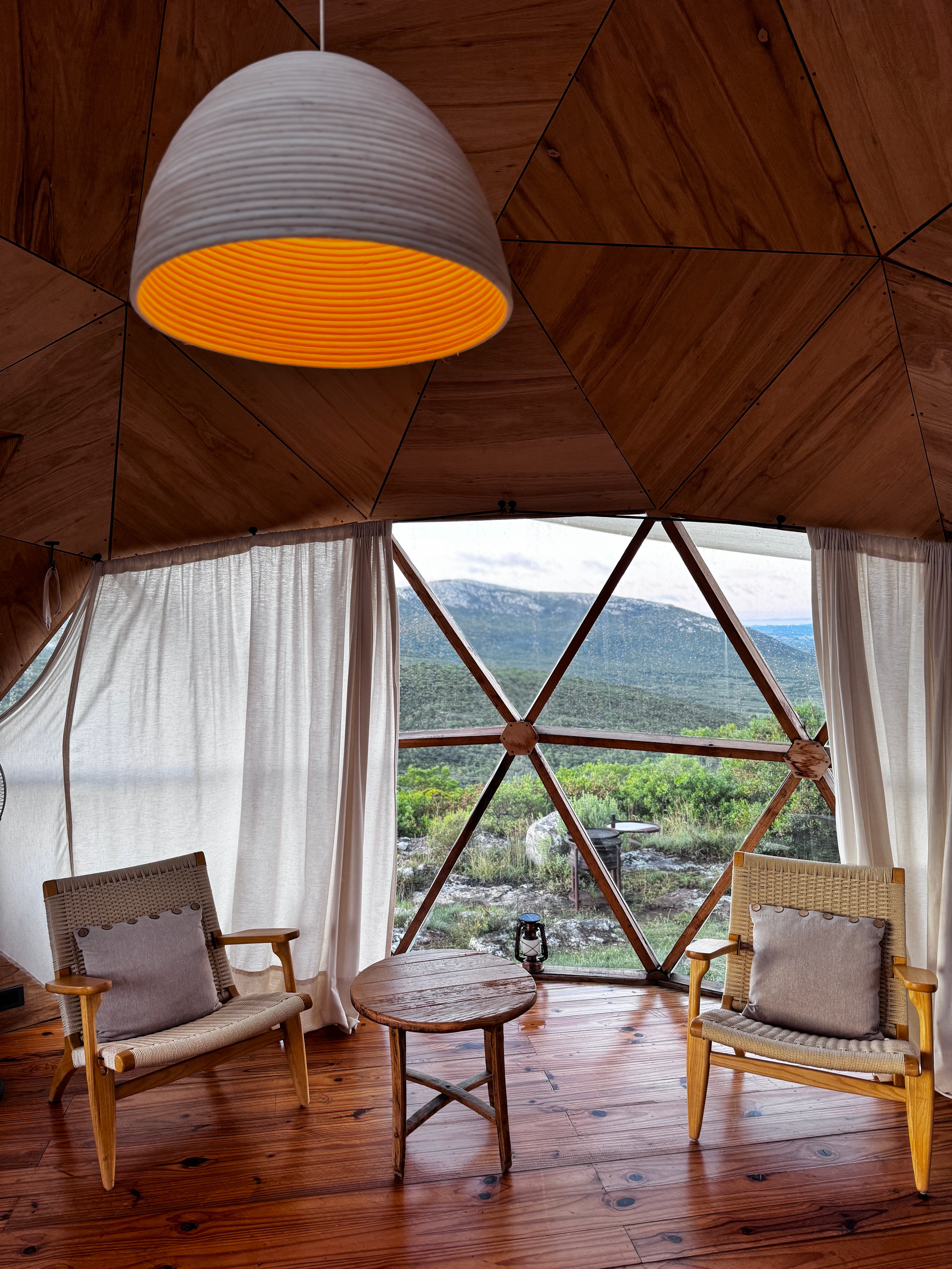 Domo con dos ambientes, dormitorio con cama king y diván, living comedor con sofá cama, cocina integrada. Los ambientes son amplios con ventanales con vista a la sierra.